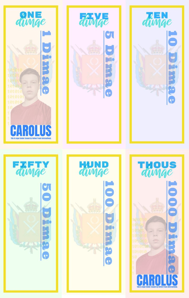 There will also be exclusive Elarian banknotes. All Elarian banknotes also feature the coat of arms of Ela’r’oech. For the Đ1 and Đ1000 banknotes, it features the face and a bust of Charles Madgett, layered in above the coat of arms but below the horizontal listed amount of money the note is worth. Below his bust, the name ‘CAROLUS’ – ‘Charles’ in latin – is featured in blue. Below ‘CAROLUS,’ are the words ‘This is legal tender issued by United Trade International.’ To the side of the bust are 1s and 0s, reminiscent of binary code as they fit to outline the bust on it’s left side.