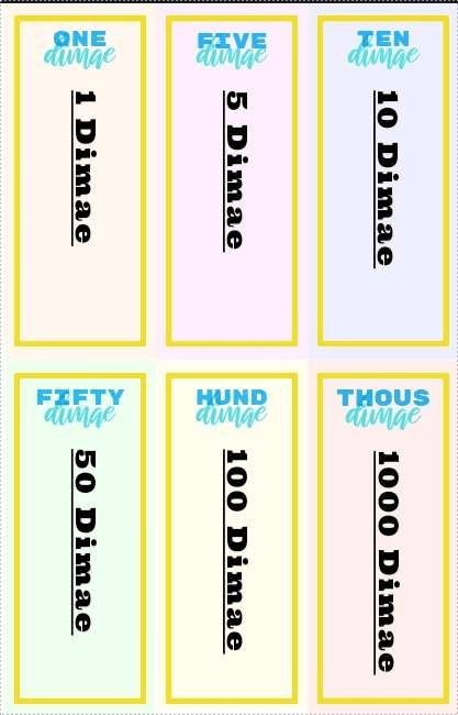 The Dimae features a randomized assortment of ‘Elarian colors,’ usually reddish, greenish, blueish, and yellowish or goldish. These colors have shades all used in notes of the Dimae. The Dimae also features the amount – in lettering – of money that the note represents. It is complimented by the same, however being read horizontally, rather than vertically.